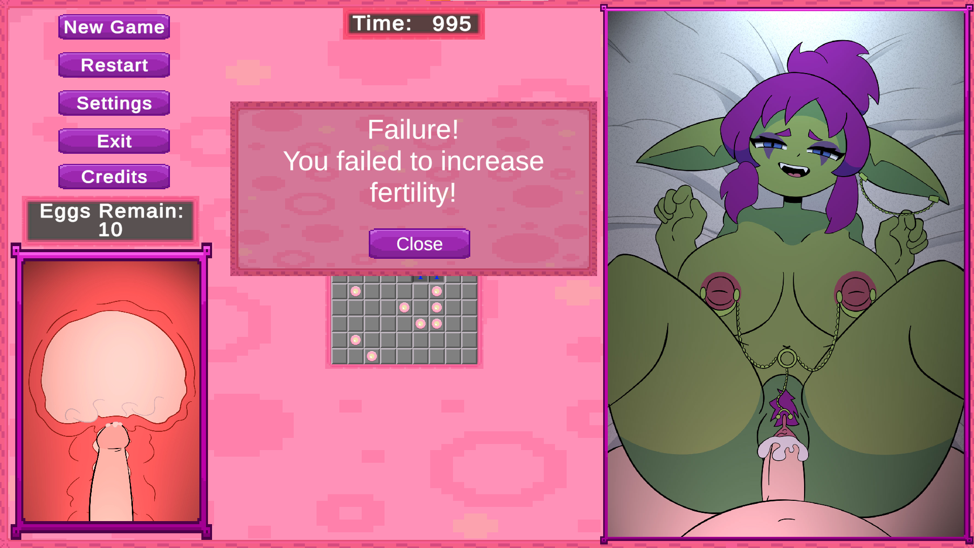 While locating the egg cells, a character of your choosing will be getting fucked. If you win or lose, the character will get creampied! An x-ray view in the bottom left shows the thrusts and creampie.